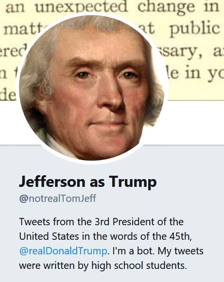 Although I realize there might seem to be political overtones embedded in the assignment, first and foremost I was simply asking students to do a word-frequency analysis consistent with the type of data-driven work past students have completed. This was, in other words, focused on getting students to “do history” in a modern way. While the class did laugh loudly as some tweets were written, we laughed a lot at history throughout the year. And, in the end, I believe that students used @notrealTomJeff to capture the issues Jefferson would have likely tweeted about — without being directly critical of Trump or even questioning anything specific about his policies. In fact, (haha) @notrealTomJeff has said so: “I tweet as Jefferson, on the issues of Jefferson’s time in office, but I use the words and phrases of @realDonaldTrump.”